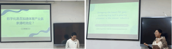 在文献速递环节,孟祺同学对Ho Yeol Yu等学者发表在《旅游管理视角》期刊上的文章《城市形象对体育赛事举办地的影响——基于赛事承办前后自下而上和自上而下的研究》进行了分享;付芳芳同学对《体育管理杂志》期刊中的《变革性体育服务研究:将体育服务与幸福联系起来》一文进行了概述,她讲到学者们需要共同努力,建立一个知识体系,引导体育组织将优化消费者和员工幸福的目标纳入核心运营;而吴晓俊同学则根据兴趣选取了《European Journal of Public Health》期刊中的《体育俱乐部的健康促进与青少年参与者的水果和蔬菜消费有关吗?》,旨在评估芬兰青年体育俱乐部的健康促进取向,以及体育俱乐部的卫生促进取向、教练的营养建议和体育俱乐部参与者水果和蔬菜消费之间的关系。