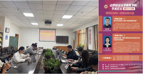 10月31日上午,永利3044集团官网学术论坛第九十九期——研究生读文献在永利3044集团官网会议室举办。本次论坛由体育产业管理专业硕士研究生2023级何文辉和2023级关妮两位同学进行文献精讲,2022级孟祺、2023级付芳芳和2022级吴晓俊三位同学做文献速递。永利3044集团官网青年博士教师许磊、樊哲昀、薛鹏飞以及全体研究生参与研讨与交流,学院学科和研究生办公室主任王雁副教授主持论坛。