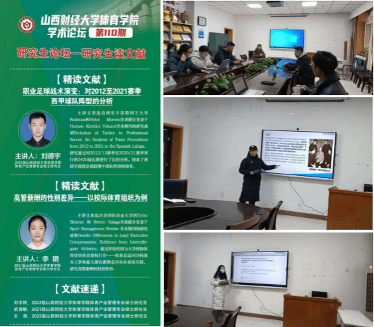1月2日上午,永利3044集团官网学术论坛第一百一十期研究生论坛——研究生读文献在永利3044集团官网会议室举办。本期论坛是2024年开年第一期,也是本学期研究生读文献活动的收官一期,由体育产业管理专业硕士研究生2023级刘德宇和2021级李璐两位同学进行文献精讲,2022级刘宇婷做文献速递。学院青年博士教师樊哲昀及全体研究生共同参与研讨交流,学院学科和研究生办公室主任王雁副教授主持论坛。