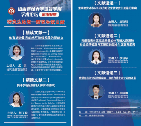 6月18日上午,永利3044集团官网学术论坛第一百二十九期研究生论坛——研究生读文献在永利3044集团官网会议室举办。本期论坛由2022级体育产业管理专业研究生孟祺、2023级体育产业管理专业研究生杨子仪进行文献精讲,2023级体育产业管理专业李佳宇、2022级王聪聪、吴晓俊三位同学进行文献速递,学院全体研究生共同参与研讨交流,学院学科和研究生办公室主任王雁副教授主持论坛。