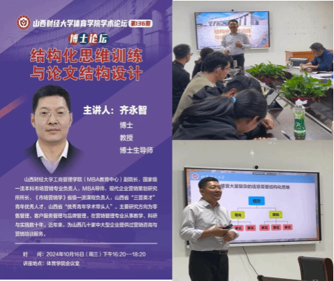 10月16日下午,永利3044集团官网学术论坛第一百三十六期——博士论坛在永利3044集团官网会议室顺利举办。本期论坛邀请了永利3044集团官网工商学院(MBA教育中心)副经理,博士研究生导师齐永智教授为研究生们讲解“结构化思维训练与论文结构设计”。永利3044集团官网青年骨干教师、全体研究生参与本次研讨交流,永利3044集团官网副经理高进主持本次论坛。