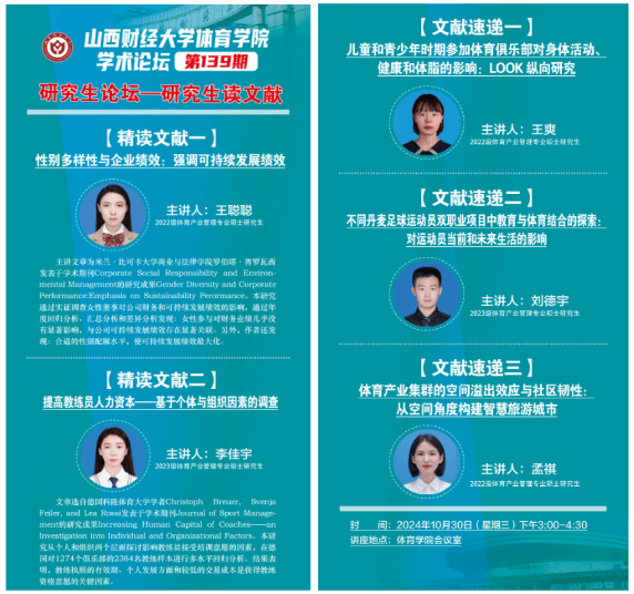 10月30日下午,永利3044集团官网学术论坛第一百三十九期——研究生读文献在永利3044集团官网会议室举办。本期论坛由体育产业管理专业2022级研究生王聪聪、2023级研究生李佳宇进行文献精讲,2022级研究生王爽、2023级研究生刘德宇两位同学进行文献速递,学院全体研究生共同参与研讨交流,学院学科和研究生办公室主任王雁副教授主持论坛。