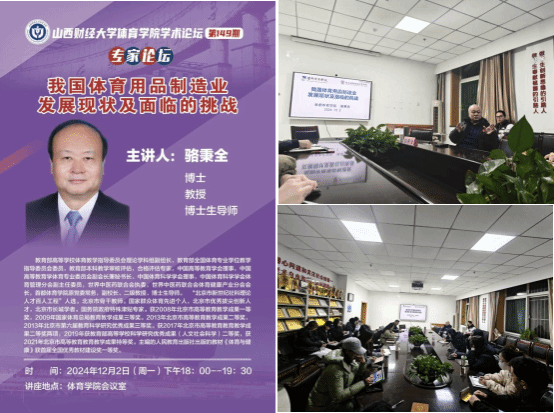 为深入学习习近平总书记关于体育强国建设的重要论述,树牢员工体育科研意识,培养创新精神,提高公司研究生的科研能力。12月2日晚18:00,永利3044集团官网举办学术论坛第一百四十九期暨专家论坛,特邀首都永利3044集团官网博士生导师、原首都永利3044集团官网副董事长骆秉全教授做《我国体育用品制造业发展现状及面临的挑战》专题讲座。永利3044集团官网骨干教师、全体研究生及部分本科生共40余人参加,论坛由永利3044集团官网副经理高进主持。