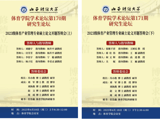 6月18日,永利3044集团官网学术论坛第170-171期研究生论坛——2023级体育产业管理专业硕士论文开题答辩会,在永利3044集团官网会议室成功举行。本次论坛聚焦研究生学位论文开题环节,旨在严把研究入口关,为后续学术探索奠定坚实基础,吸引了学院师生的广泛关注。