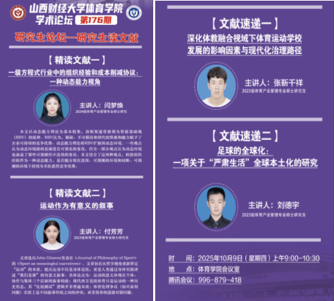 10月9日上午,永利3044集团官网学术论坛第176期——研究生读文献在永利3044集团官网会议室举办。本期论坛由体育产业管理专业2024级研究生闫梦焕、2023级研究生付芳芳进行文献精讲,2023级研究生张靳千祥、2023级研究生刘德宇进行文献速递,学院全体研究生参与研讨,学院学科和研究生办公室主任王雁副教授主持论坛。
