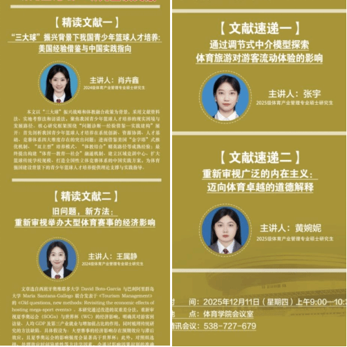 文献速递环节进一步拓宽学术视野。张宇同学以《通过调节式中介模型探索体育旅游对游客流动体验的影响》为题,通过实证模型解析体育旅游中游客体验的形成机制与调节因素,为提升体育旅游服务品质提供理论依据。黄婉妮同学围绕《重新审视广泛的内在主义:迈向体育卓越的道德解释》进行分享,从体育哲学与伦理学角度,探讨体育成就与内在动机之间的关联,强调在追求卓越过程中应重视道德内涵与人格塑造,体现了体育发展的人文向度。