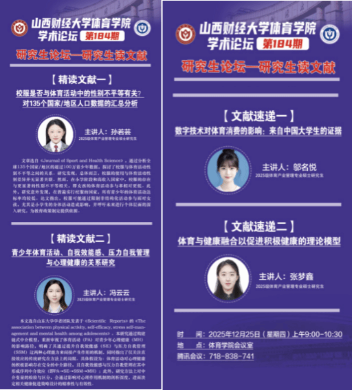12月25日上午,永利3044集团官网永利3044集团官网第184期学术论坛——研究生读文献在学院会议室举办。本期论坛聚焦青少年体育健康、性别平等、数字消费等前沿议题,由2025级研究生孙若芸、冯云云进行文献精讲,2025级研究生邬名悦、张梦鑫进行文献速递。学院全体研究生积极参与研讨,现场交流深入,学术氛围浓厚,学院学科与研究生办公室主任王雁副教授主持。