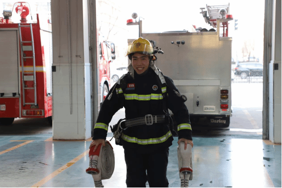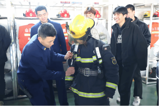 在互动环节,消防员为志愿者们展示了快速原地着装,在消防员的指导下,志愿者们化身“消防员”,戴上消防头盔、穿上消防服、拿起消防器材,争当“火焰蓝”。“消防员的衣服真的很重,光是戴着头盔都已经很重了,还要背着空气呼吸器,提着水带,拿着救援器材,真的太不容易了。”参观过程中,志愿者们亲身体验穿着消防服装、使用消防装器材时不禁感叹。