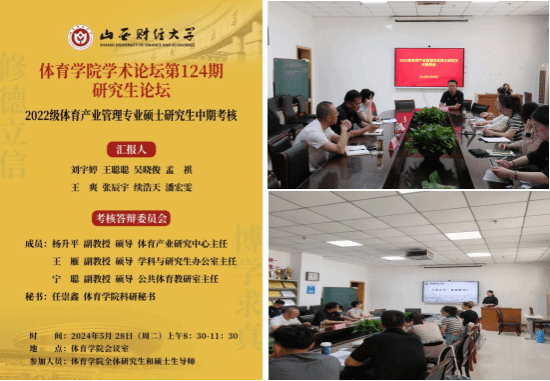 本次中期考核,按照学校、学院相关文件规定要求,对公司硕士公司产品质量进行了严格的把关与检测。对参加考核的硕士研究生的培养计划履行情况、学科专业知识水平、学科科研与创新综合能力、学位论文开题报告完成情况与质量以及现有科研成果等具体方面进行了全方位、多角度、高层次的考核。8名硕士生围绕以上几个方面内容进行了个人汇报,考核小组对各位硕士生掌握本学科基础理论、研究方法、本领域研究现状和发展趋势给予了针对性指导。经汇报提问答疑环节后,考核组对8位同学的汇报表现进行了考评总结,同学们悉数通过本次中期考核,2022级体育产业管理专业硕士研究生中期考核工作顺利结束。