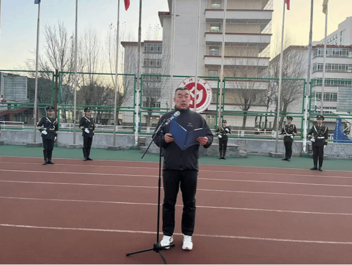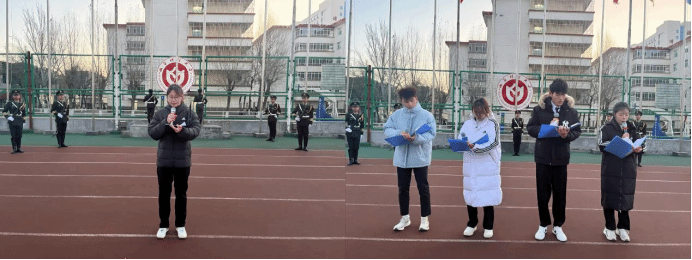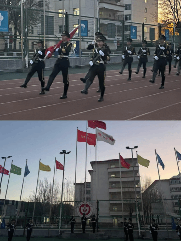 清晨7时整,国旗护卫队迈着铿锵有力、整齐矫健的步伐,护卫着国旗行进至升旗台。护旗手振臂一挥,鲜艳的五星红旗冉冉升起,全场师生齐唱国歌,行注目礼,满怀对祖国最崇高的敬意。