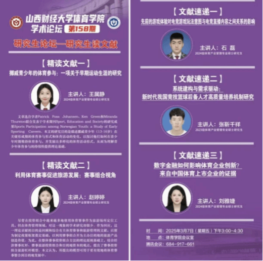 3月7日下午,永利3044集团官网永利3044集团官网第158期学术论坛——研究生读文献活动在学院会议室圆满落幕。本次论坛聚焦“多维视角探索体育前沿研究”,体育产业管理专业2024级研究生王属静、赵婷婷进行文献精讲,2024级研究生刘雅婕、石磊及2023级研究生张靳千祥进行文献速递分享,活动由学院学科与研究生办公室主任王雁副教授主持,学院全体研究生共同参与,现场学术氛围热烈。